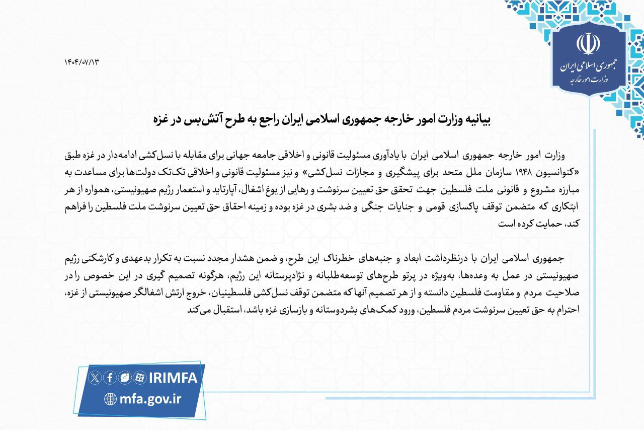 The Ministry of Foreign Affairs of the Islamic Republic of Iran, recalling the legal and moral responsibility of the international community to confront the ongoing genocide in Gaza under the 1948 UN Convention on the Prevention and Punishment of the Crime of Genocide, and the legal and moral responsibility of all governments to support the legitimate and lawful struggle of the Palestinian people to realize their right to self-determination and liberation from the yoke of occupation, apartheid, and colonialism by the Zionist regime, has consistently supported any initiative that entails the cessation of ethnic cleansing, war crimes, and crimes against humanity in Gaza and paves the way for the realization of the Palestinian people's right to self-determination.