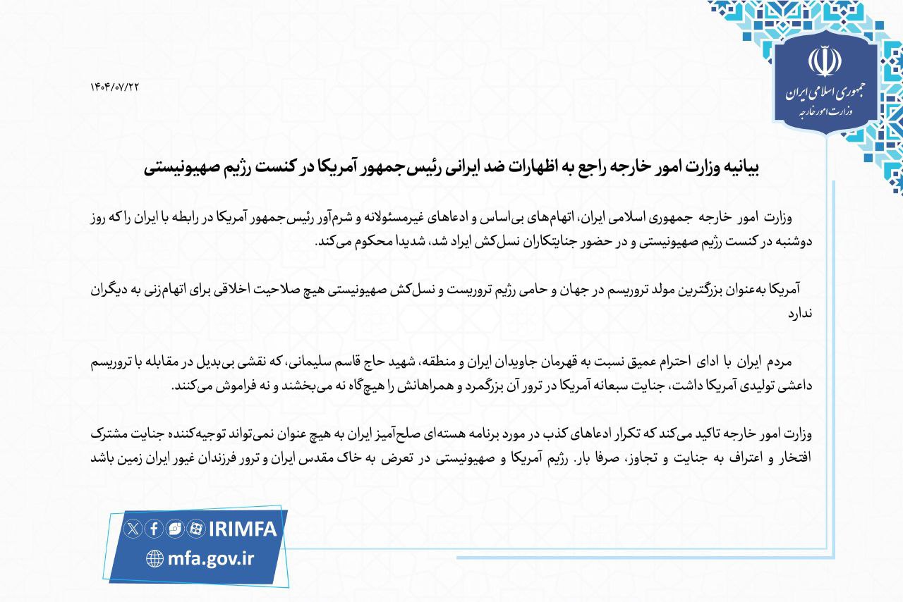 The Foreign Ministry of the Islamic Republic of Iran strongly condemns the baseless accusations and irresponsible shameful claims made by the President of the United States about Iran delivered on Monday in the Zionist regime’s Knesset in the presence of war criminals responsible for genocide.